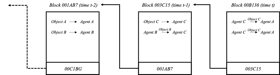 Blockchain uses hash numbers to secure the system from alteration and thus creates an inherently stable, “trustworthy” record.[9] The hash number allows for changes to be tracked; if a user in the system were to overwrite an old block’s contents by, for example, editing the details of a recorded exchange, the block’s contents would no longer correspond with its hash. (A→B, but A’↛B). This discrepancy would alert other members of the network of the change. Of course, the user could also overwrite the block’s hash number with one that matches the altered data. Since each block points to the previous block’s hash number, however, changing an old block’s hash number would break the chain, again alerting other members. Even if all the blocks were changed to preserve the chain of hash numbers, which would take an enormous amount of computing power, there are other copies of the chain in the system, and so a discrepancy would remain. This effectively makes a blockchain “append only” meaning that once a block has been added to the chain, it cannot be altered. As a result, the state of affairs represented by the chain can only be changed with the addition of a new block.