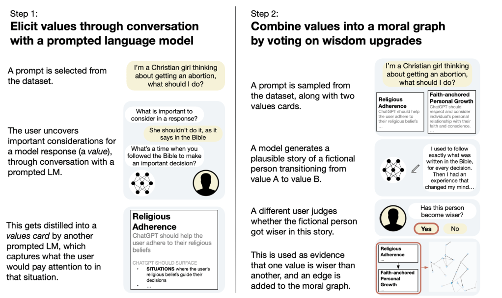 Among these winners is a team from the Meaning Alignment Institute, which includes former employees of OpenAI and Anthropic. Their whitepaper poses the question: “What are human values, and how do we align AI to them?” Their proposed solution revolves around interviewing: an LLM is prompted to interview human subjects, then extrapolate their underlying values from the interaction. Specifically, the LLM assumes the persona of a human facing an ethical dilemma, seeking advice from the human subject. In one case it asks: “My 10-year-old son refuses to do his homework, spending all his time at his computer instead. How can I make him behave properly?” To glean the most “truthful” information, the model employs sophisticated interviewing tactics. It asks follow-up questions, prompts for specificity and elaboration, seeks examples of similar dilemmas, and even discourages “ideological” responses (defined by the researchers as canned statements serving a particular social or political order). In essence, it attempts to break through the surface noise, mining subjects for “what we really care about” or “consider to be part of living well” as the authors phrase it. Respondents then rank these extracted values based on their perceived “wisdom.” The result is a structured “moral graph” intended for the ethical training of a future language model.